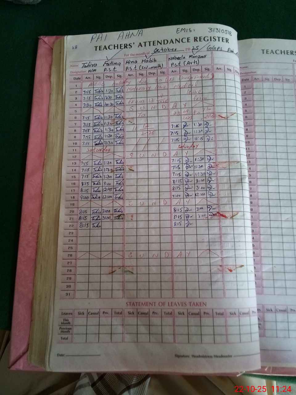 | 31**** | Hi**** Ha**** | PST | Regular | 19 | 0 | 0 | 18 | 0 | 0 | 0 | 0 | 1 | Maternity |