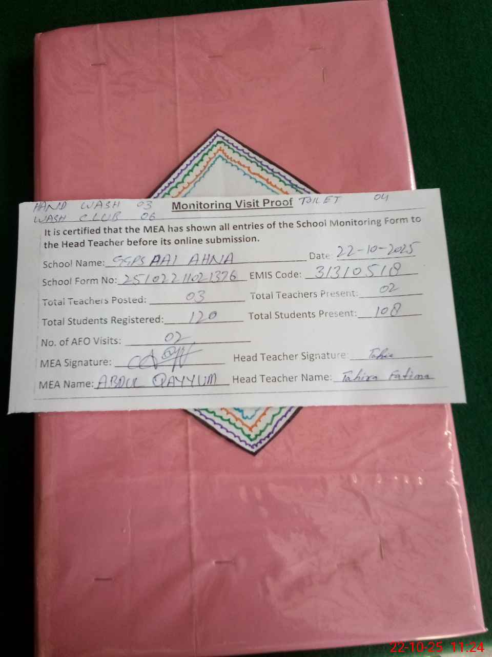 | Attendance Register | Head Teacher | MEA with School | Visit Proof |