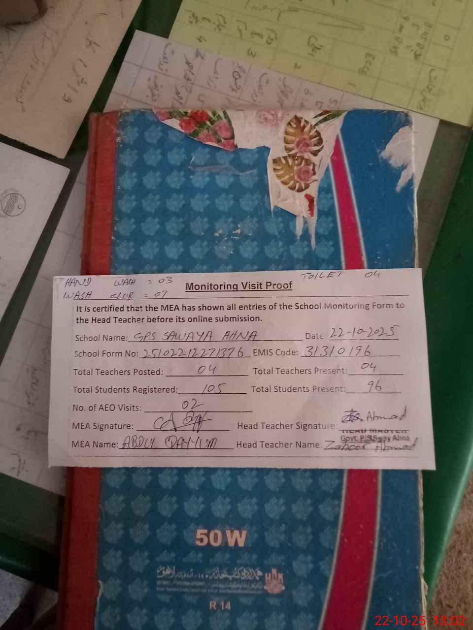 | EMIS Code: 31310196 | Name of School: GPS SWAYA AHNA (After Noon) | |||
