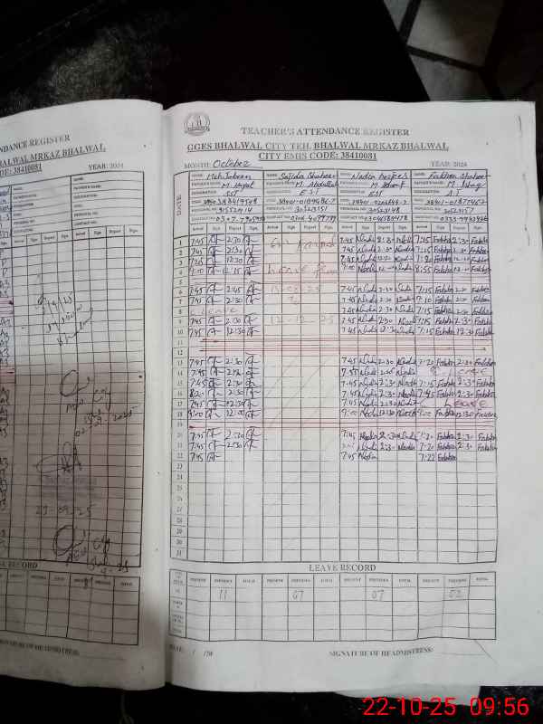 | Remarks (Use Separate Page if Required): During visit found teacher Sajida Shaheen was not present in school and no sanctioned documents available Teacher Bader Sultana was marked on casual leave but leave did not apply on HRMIS | |||||