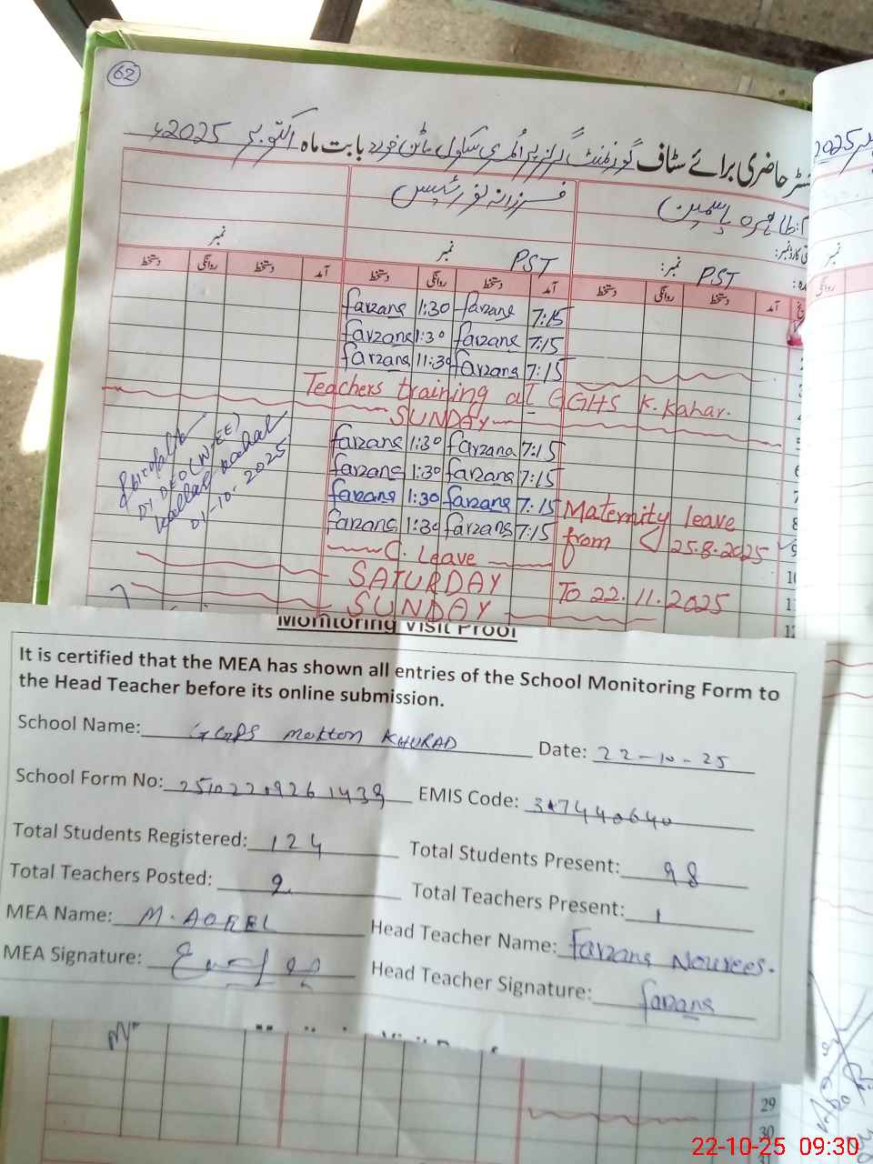 | Attendance Register | Head Teacher | MEA with School | Visit Proof |