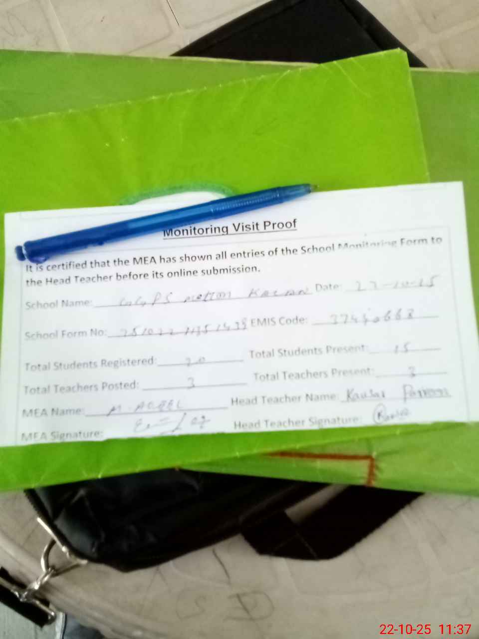 | Attendance Register | Head Teacher | MEA with School | Visit Proof |
