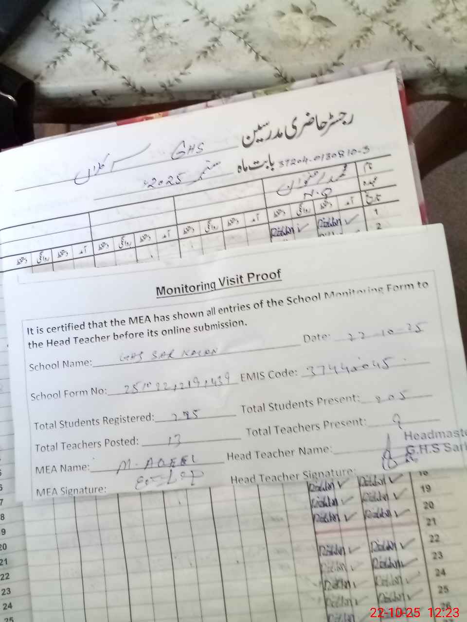 | Attendance Register | Head Teacher | MEA with School | Visit Proof |