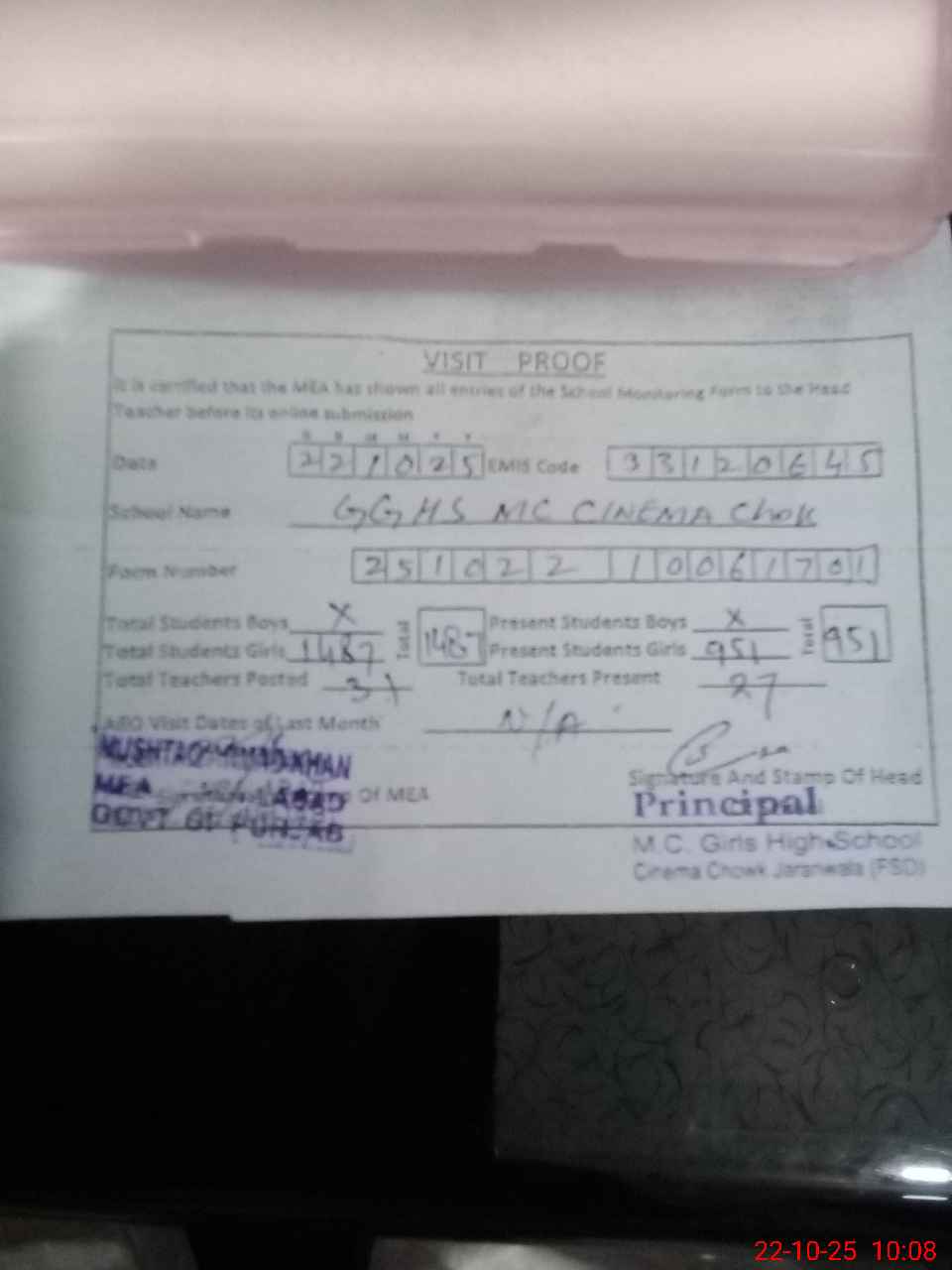 | Certified that this School was Inspected by the Undersigned MEA/DMO Today and the Information Stated Above is as Per Record. | |||||