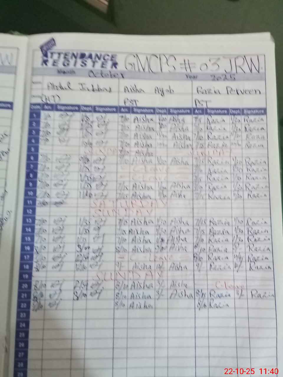 | CNIC | Full Name | Designation | R/C | Absence During Last Calender Month |