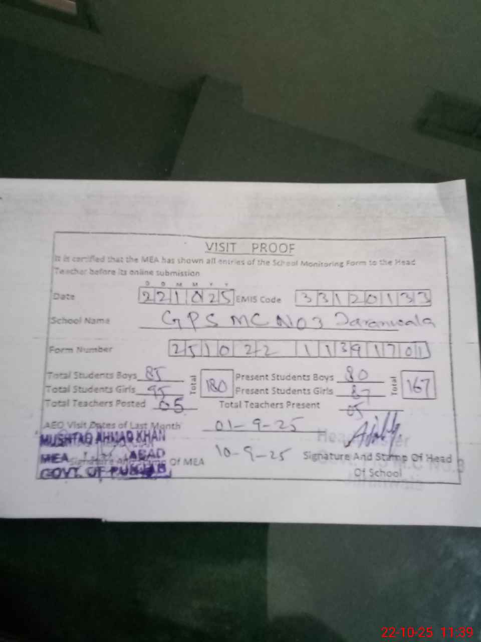 | Attendance Register | Head Teacher | MEA with School | Visit Proof |