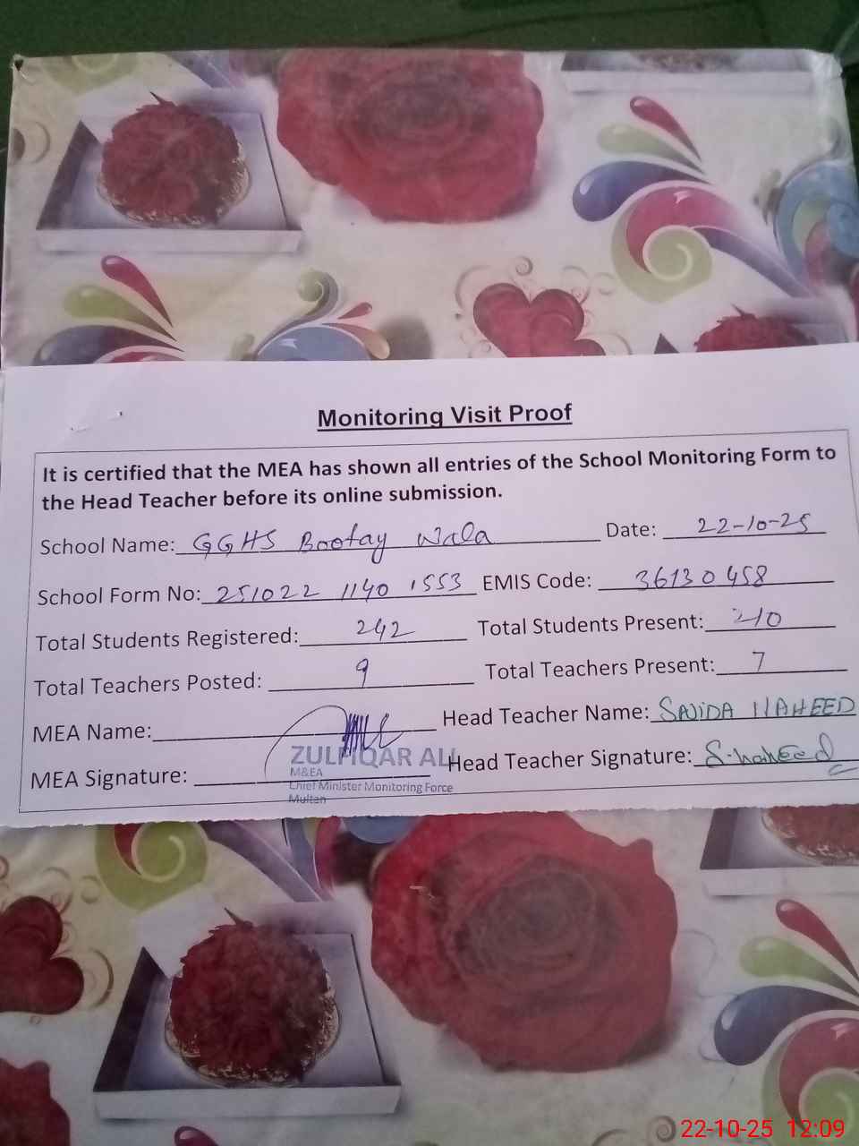 | EMIS Code: 36130458 | Name of School: GGHS BOTAY WALA MAKHDOOM RASHEED | |||