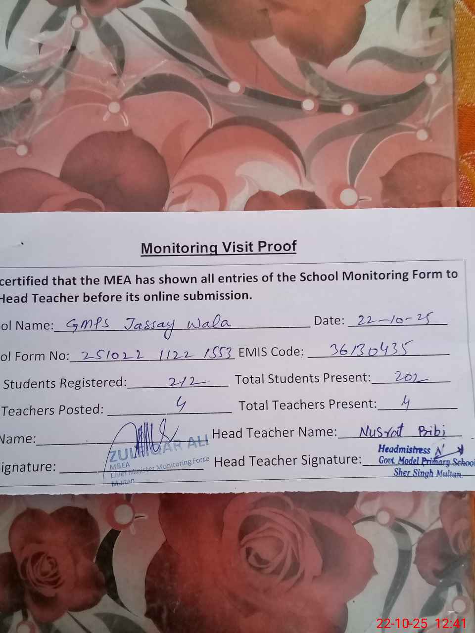 | EMIS Code: 36130435 | Name of School: GMPS JASSAY WALA MULTAN | |||