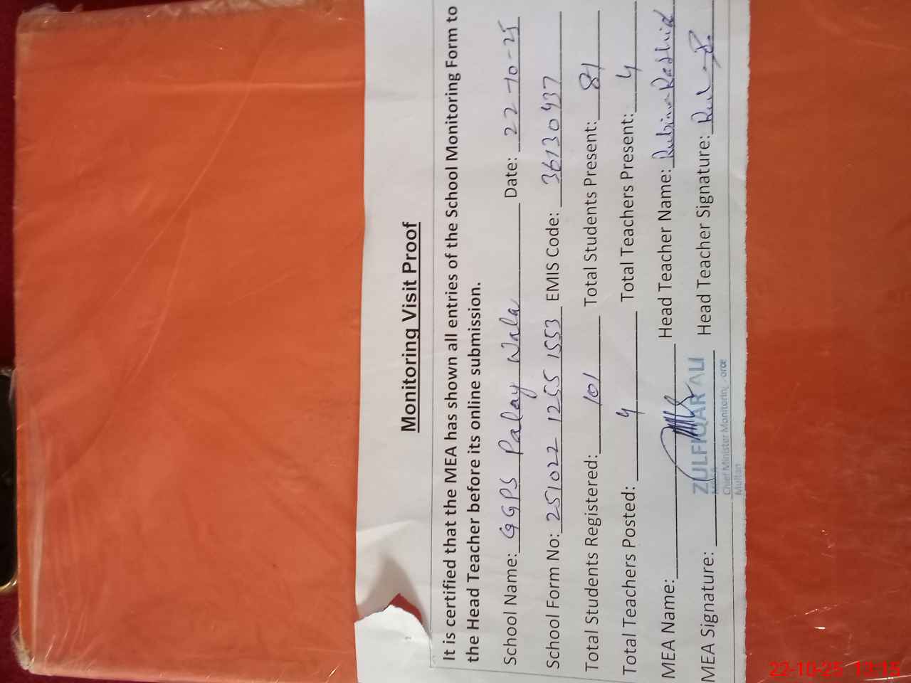 | Attendance Register | Head Teacher | MEA with School | Visit Proof |