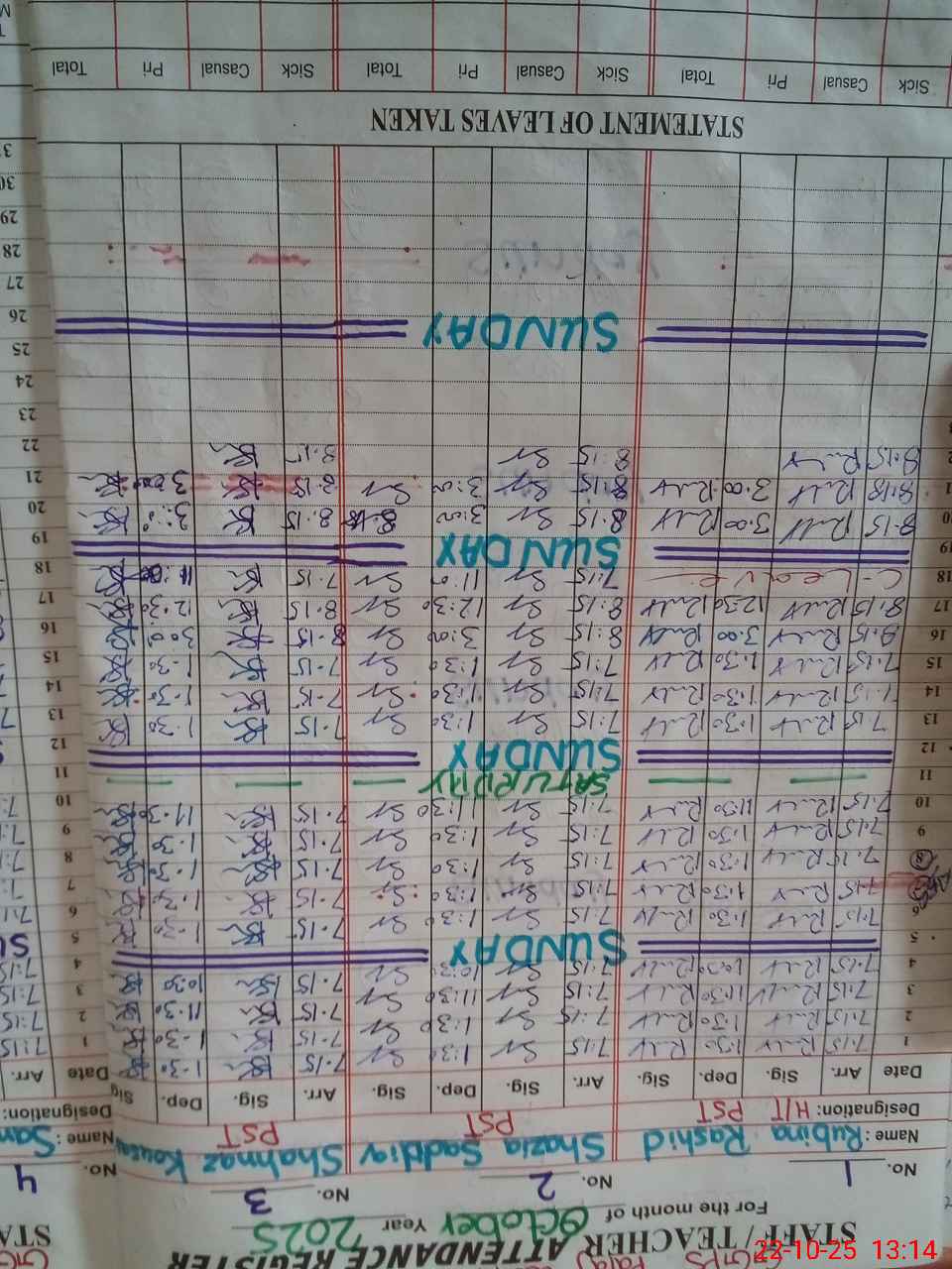 | CNIC | Full Name | Designation | R/C | Absence During Last Calender Month |