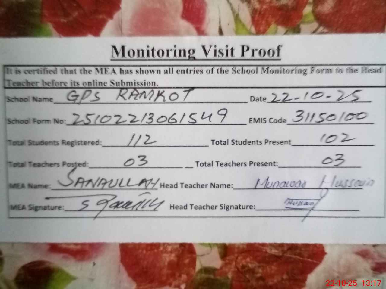 | Attendance Register | Head Teacher | MEA with School | Visit Proof |