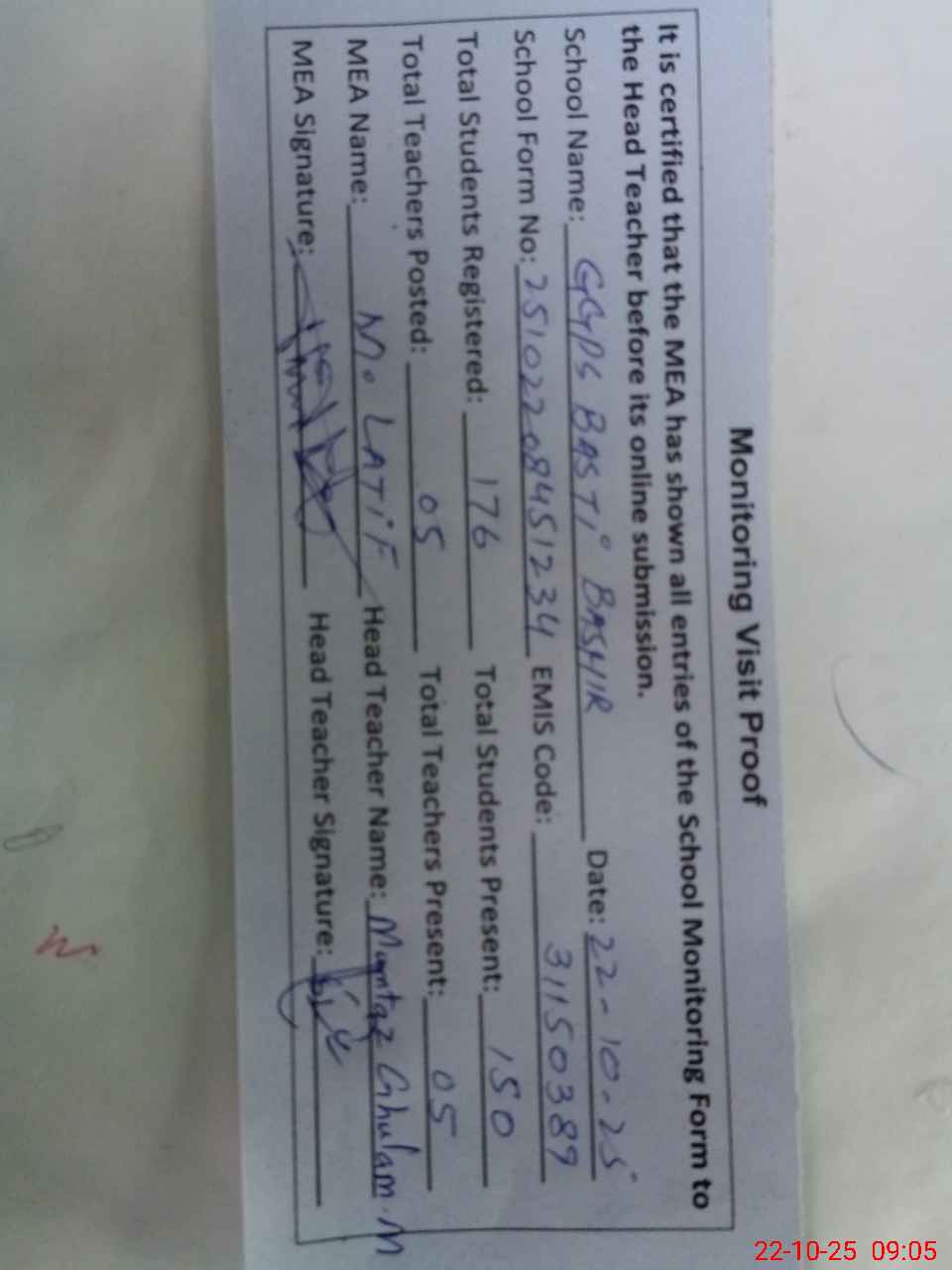 | Certified that this School was Inspected by the Undersigned MEA/DMO Today and the Information Stated Above is as Per Record. | |||||