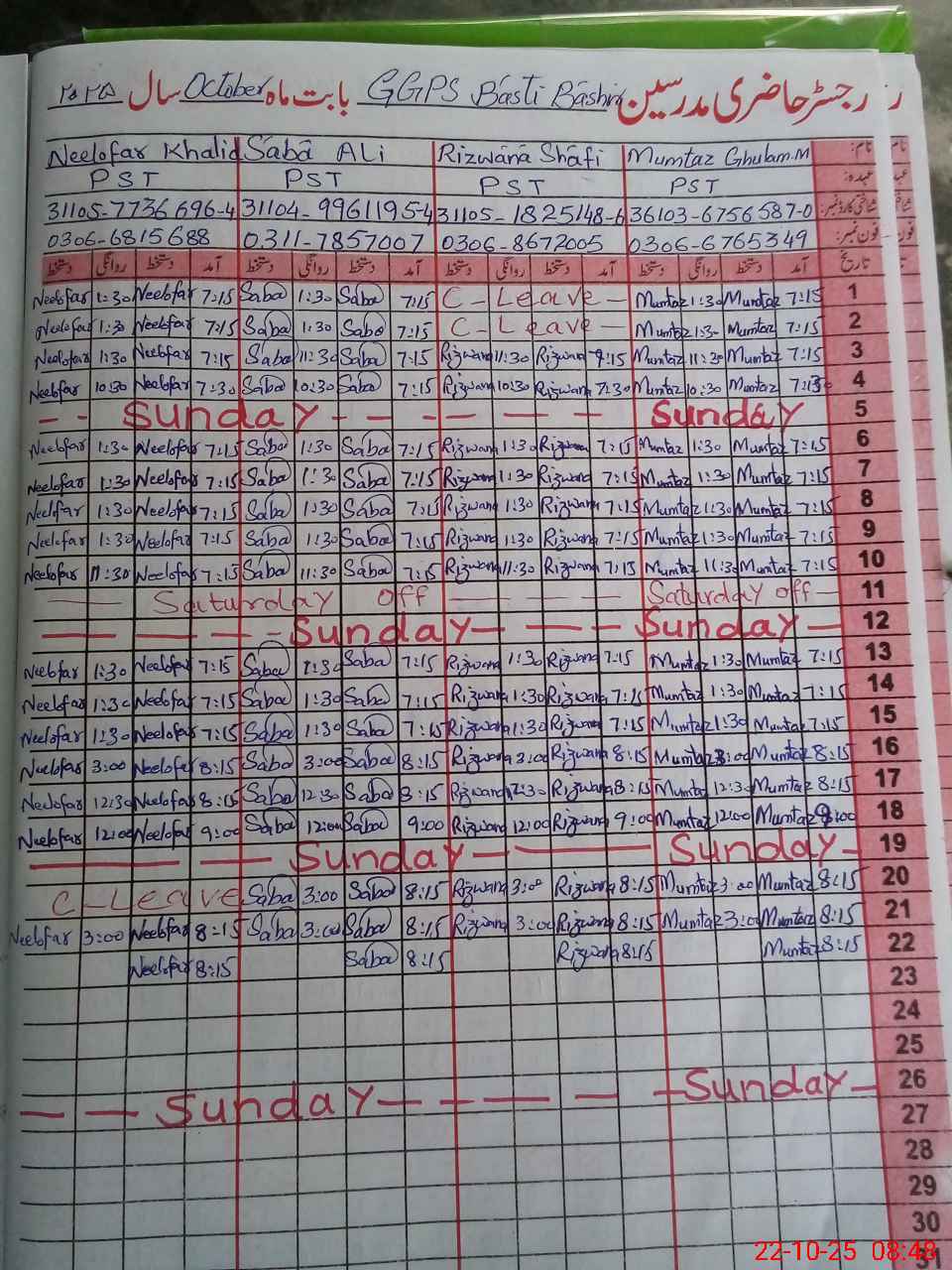 | CNIC | Full Name | Designation | R/C | Absence During Last Calender Month |
