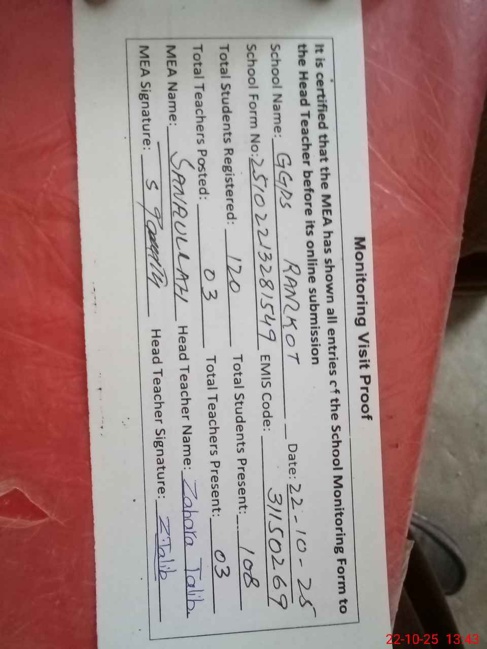 | Attendance Register | Head Teacher | MEA with School | Visit Proof |