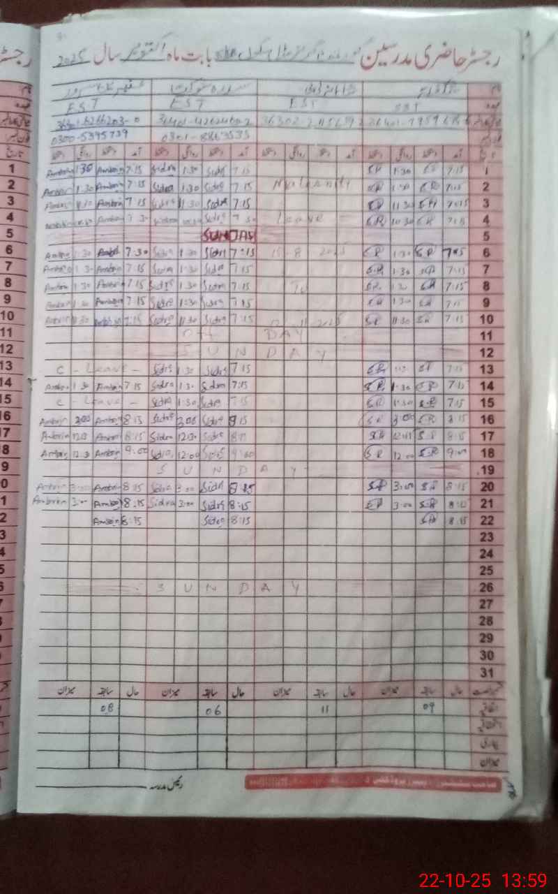 | CNIC | Full Name | Designation | R/C | Absence During Last Calender Month |