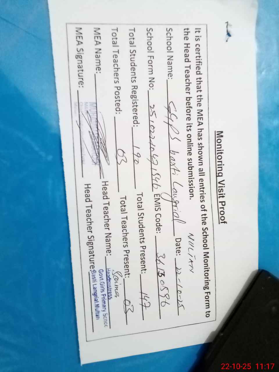 | Attendance Register | Head Teacher | MEA with School | Visit Proof |