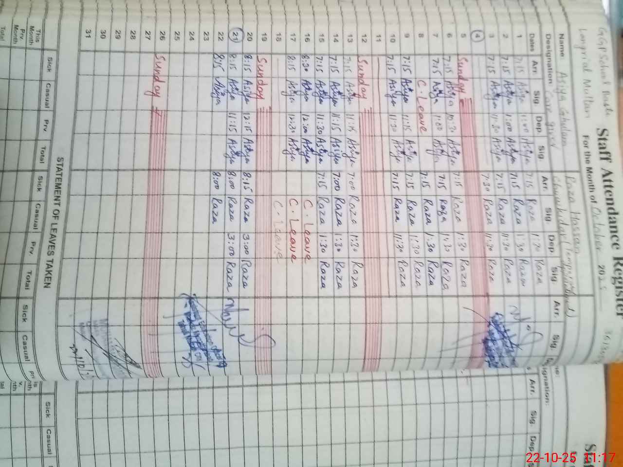| CNIC | Full Name | Designation | R/C | Absence During Last Calender Month |