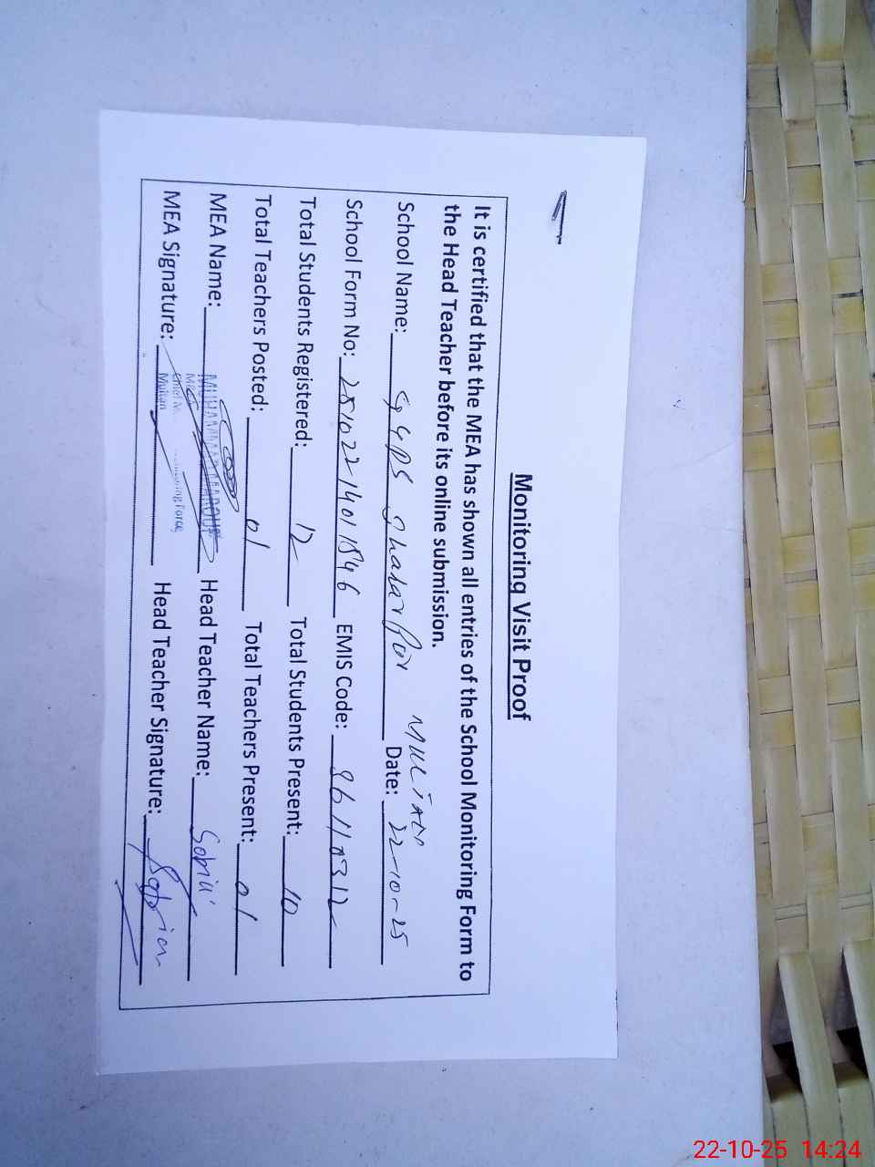 | Remarks (Use Separate Page if Required): School handed over to 13th October 25 School is flood affected rooms and boundary wall got ceapage Badly need white wash No books record Water pump stolen water not available for drinking as well as for toilets Very less students enrollment as the total strength is 12 School is not running properly yet | |||||