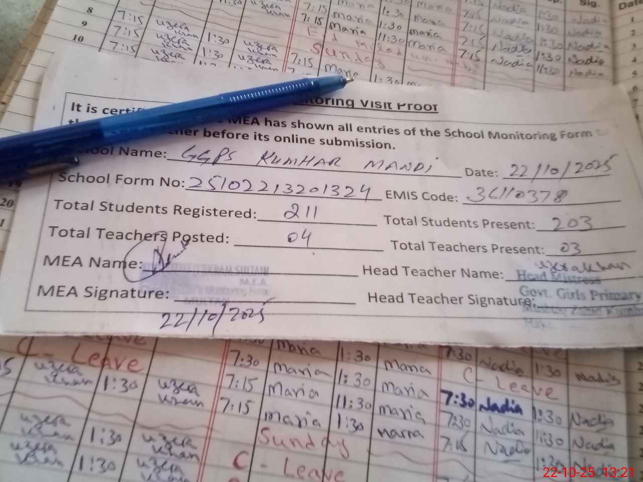 | EMIS Code: 36110378 | Name of School: GGPS MC KUMHAR MANDI WALAYAT ABAD NO.1 MULTAN | |||