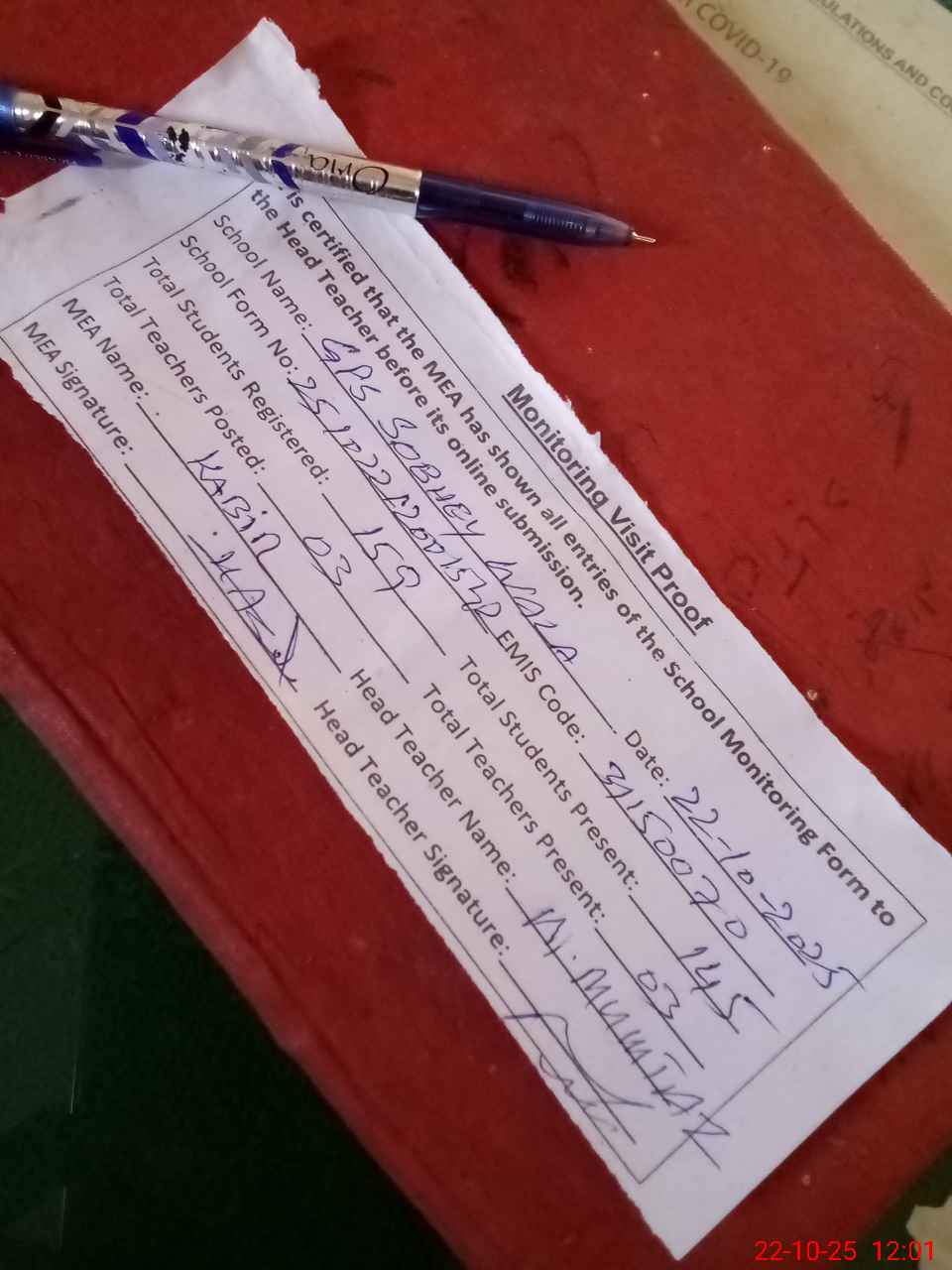 | Attendance Register | Head Teacher | MEA with School | Visit Proof |