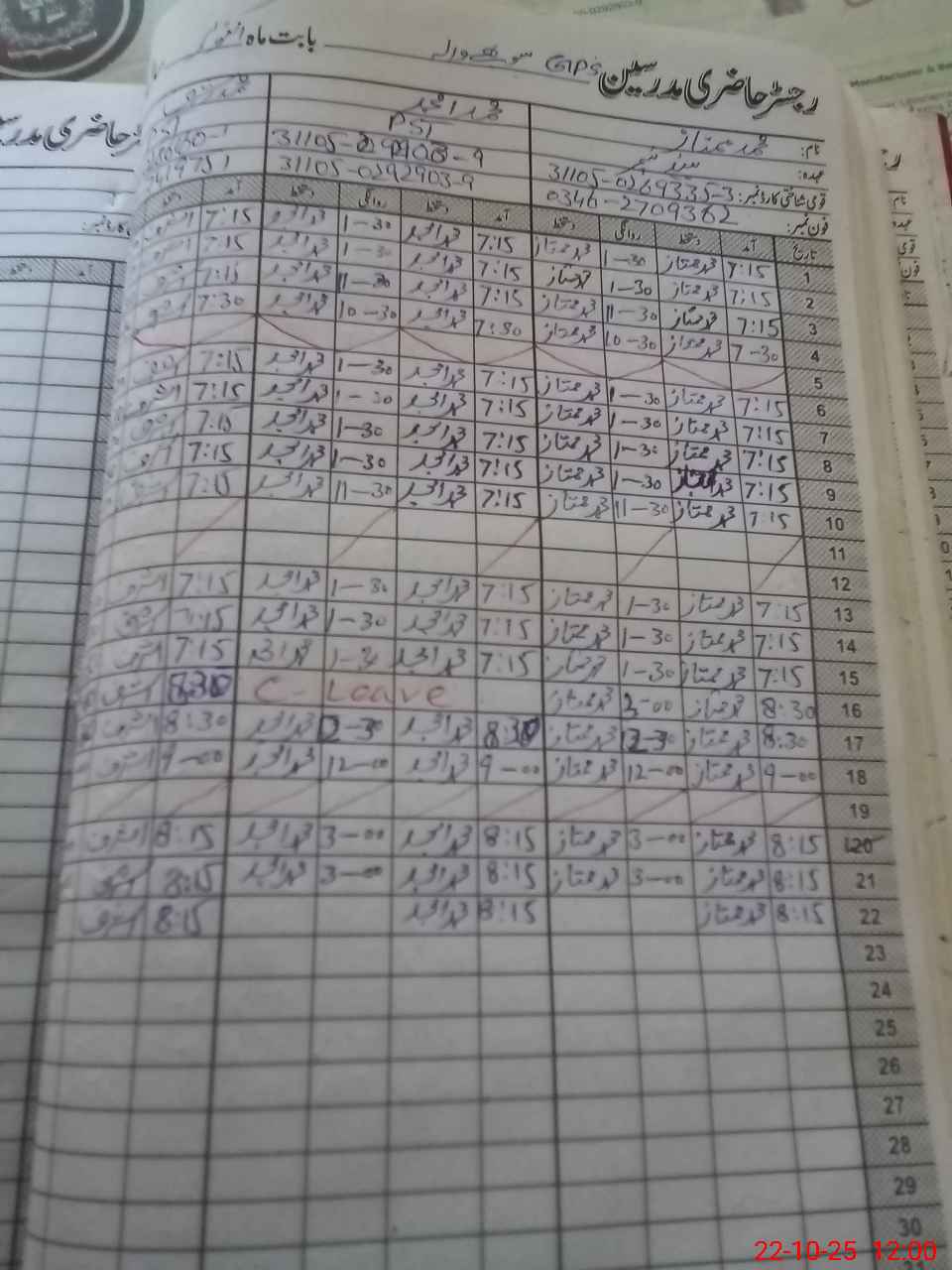 | CNIC | Full Name | Designation | R/C | Absence during last cal. month |