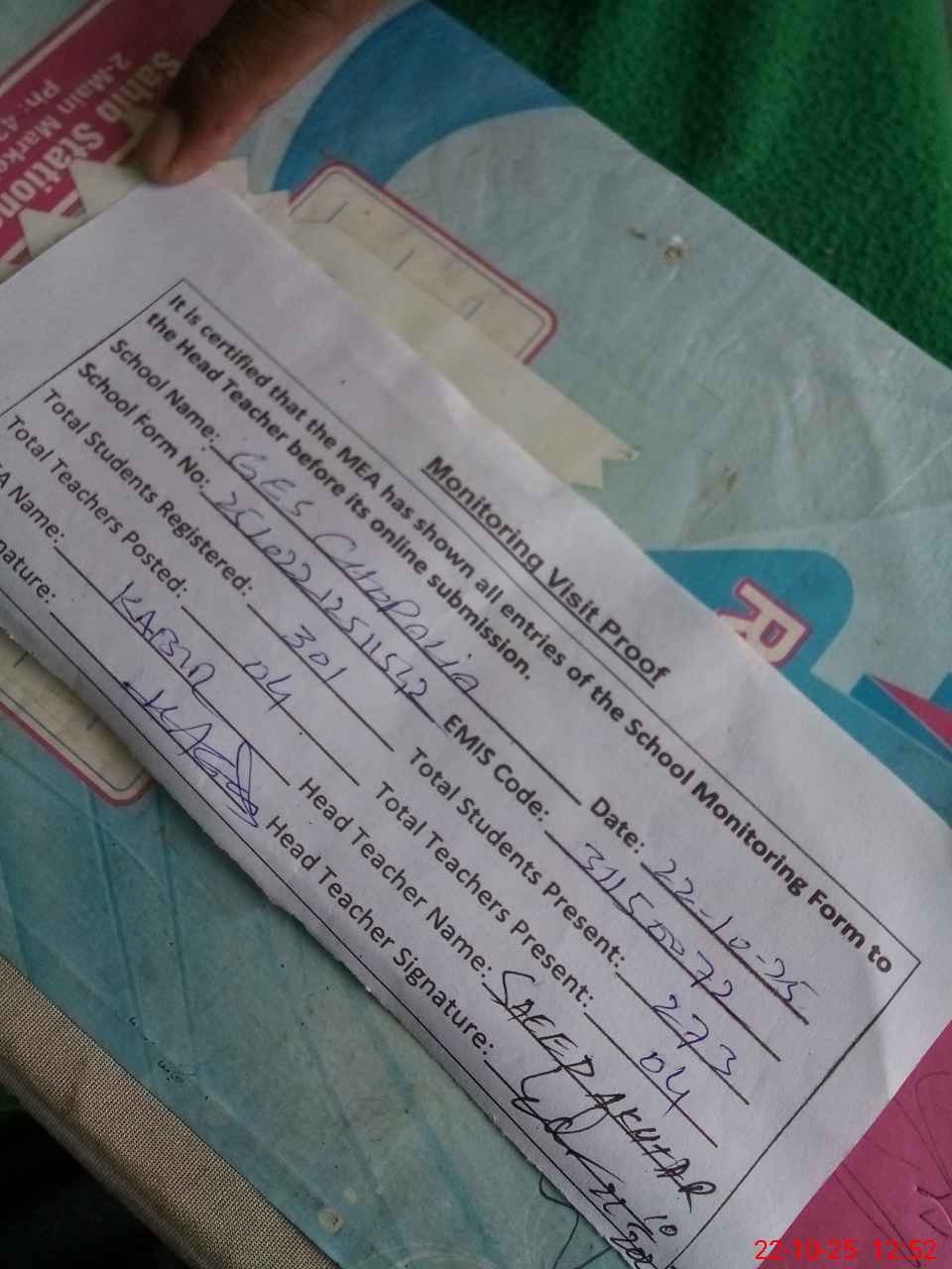 | Attendance Register | Head Teacher | MEA with School | Visit Proof |