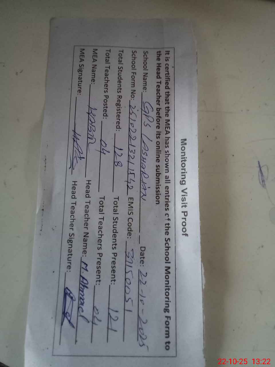 | Attendance Register | Head Teacher | MEA with School | Visit Proof |