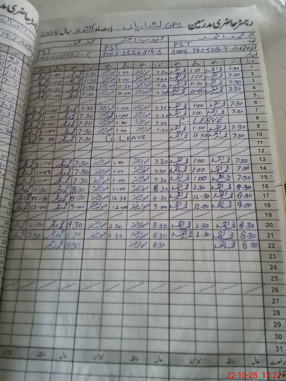 | CNIC | Full Name | Designation | R/C | Absence during last cal. month |