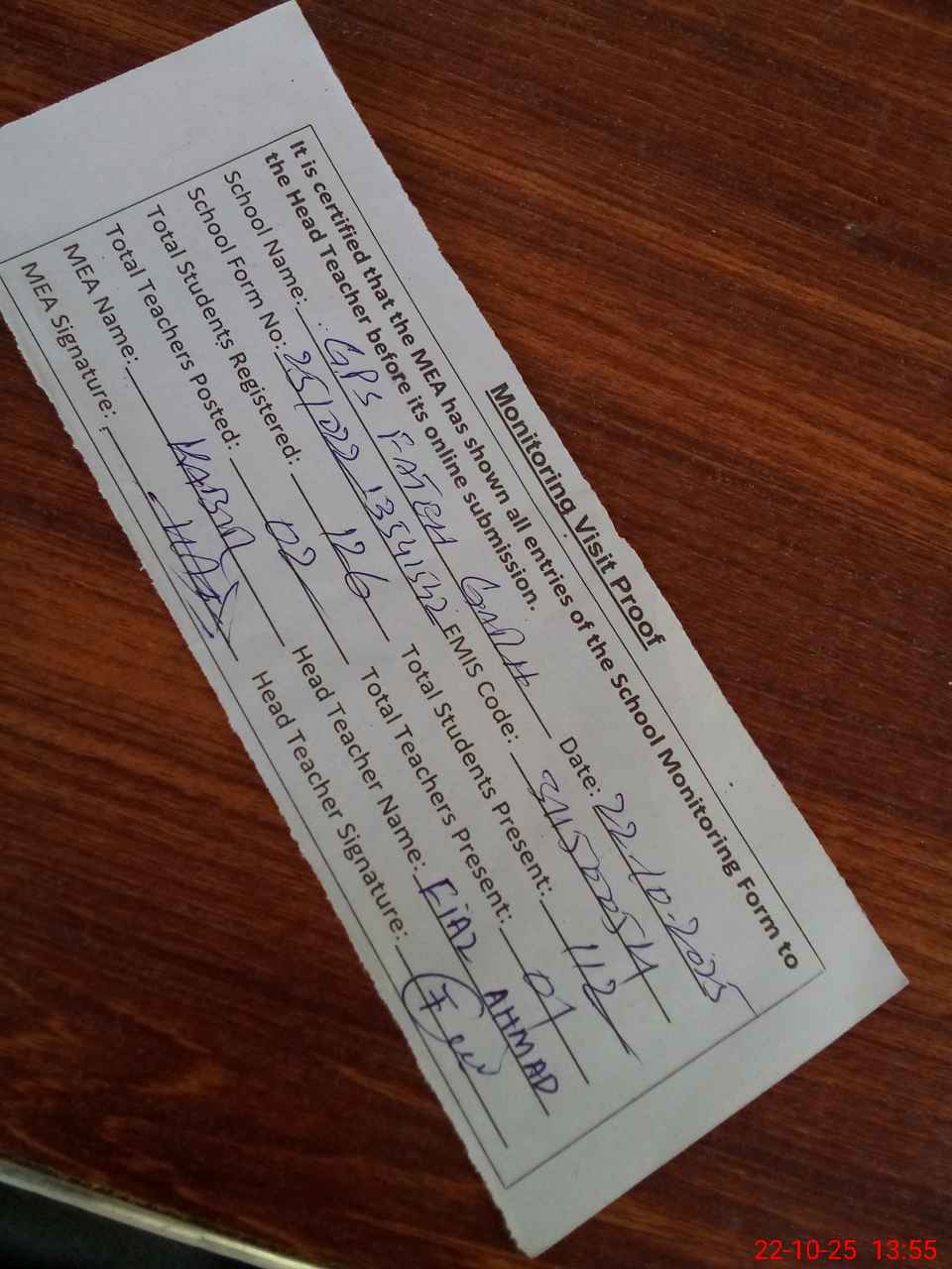 | Attendance Register | Head Teacher | MEA with School | Visit Proof |