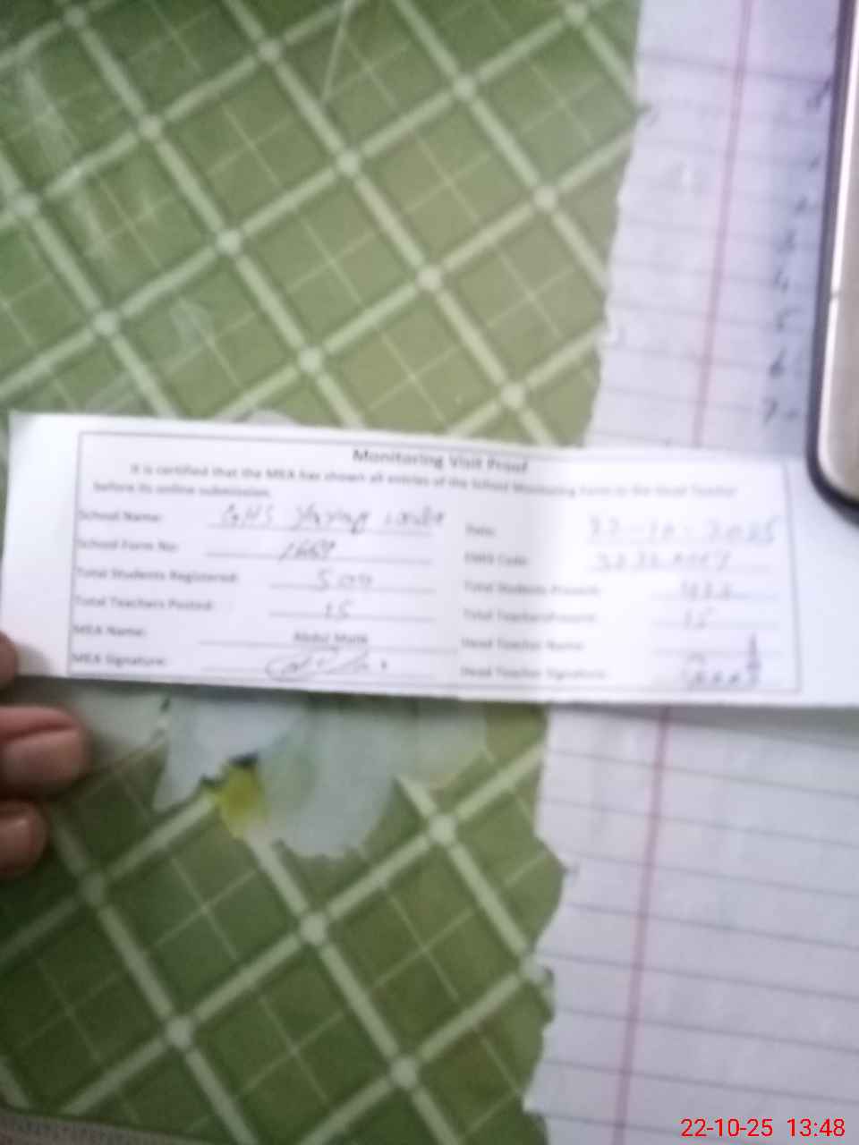 | Name: M.**** Designation: (School Headmaster's/Headmistress's) HEADMASTER Phone/Cell Number: 03**** |