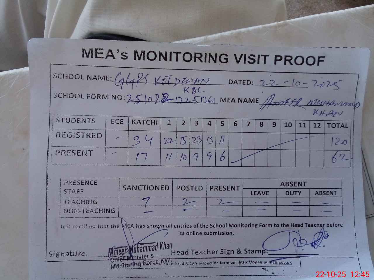 | EMIS Code: 36410470 | Name of School: GGPS KOT DEWAN, ABDUL HAKIM | |||