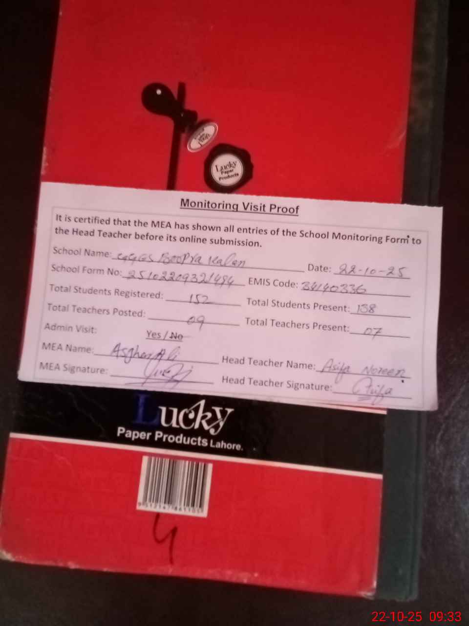 | Attendance Register | Head Teacher | MEA with School | Visit Proof |
