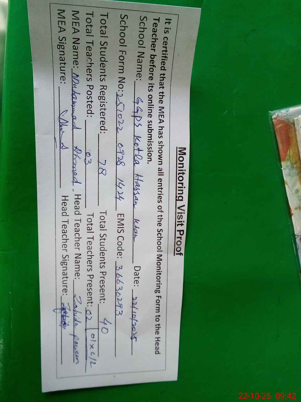 | Attendance Register | Head Teacher | MEA with School | Visit Proof |
