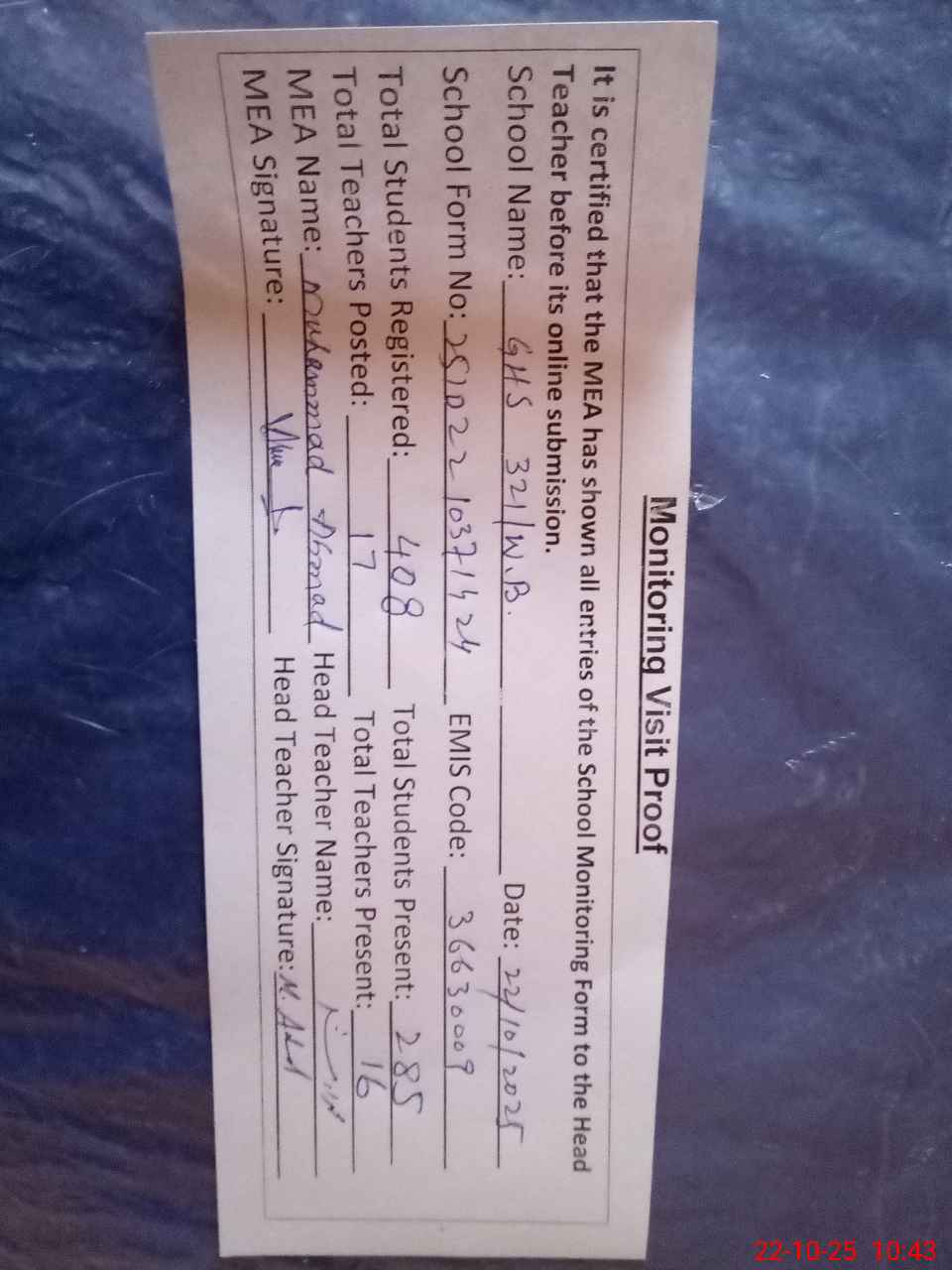 | Attendance Register | Head Teacher | MEA with School | Visit Proof |