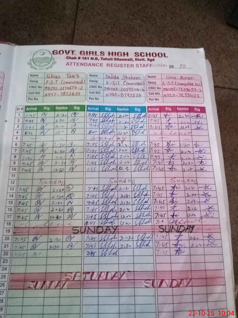 | CNIC | Full Name | Designation | R/C | Absence during last cal. month |