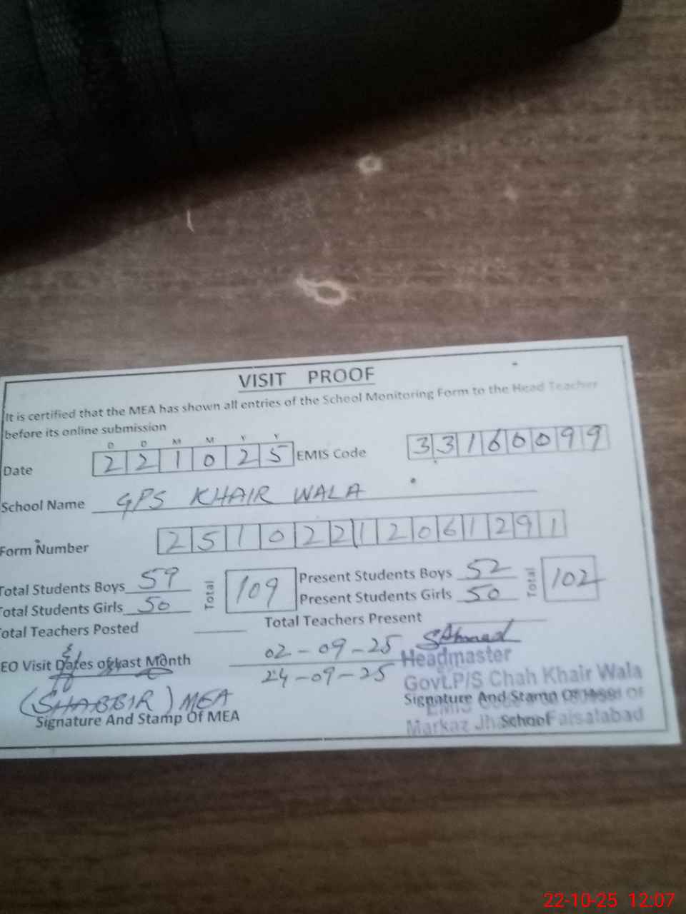 | EMIS Code: 33160099 | Name of School: GPS KHAIR WALA | |||