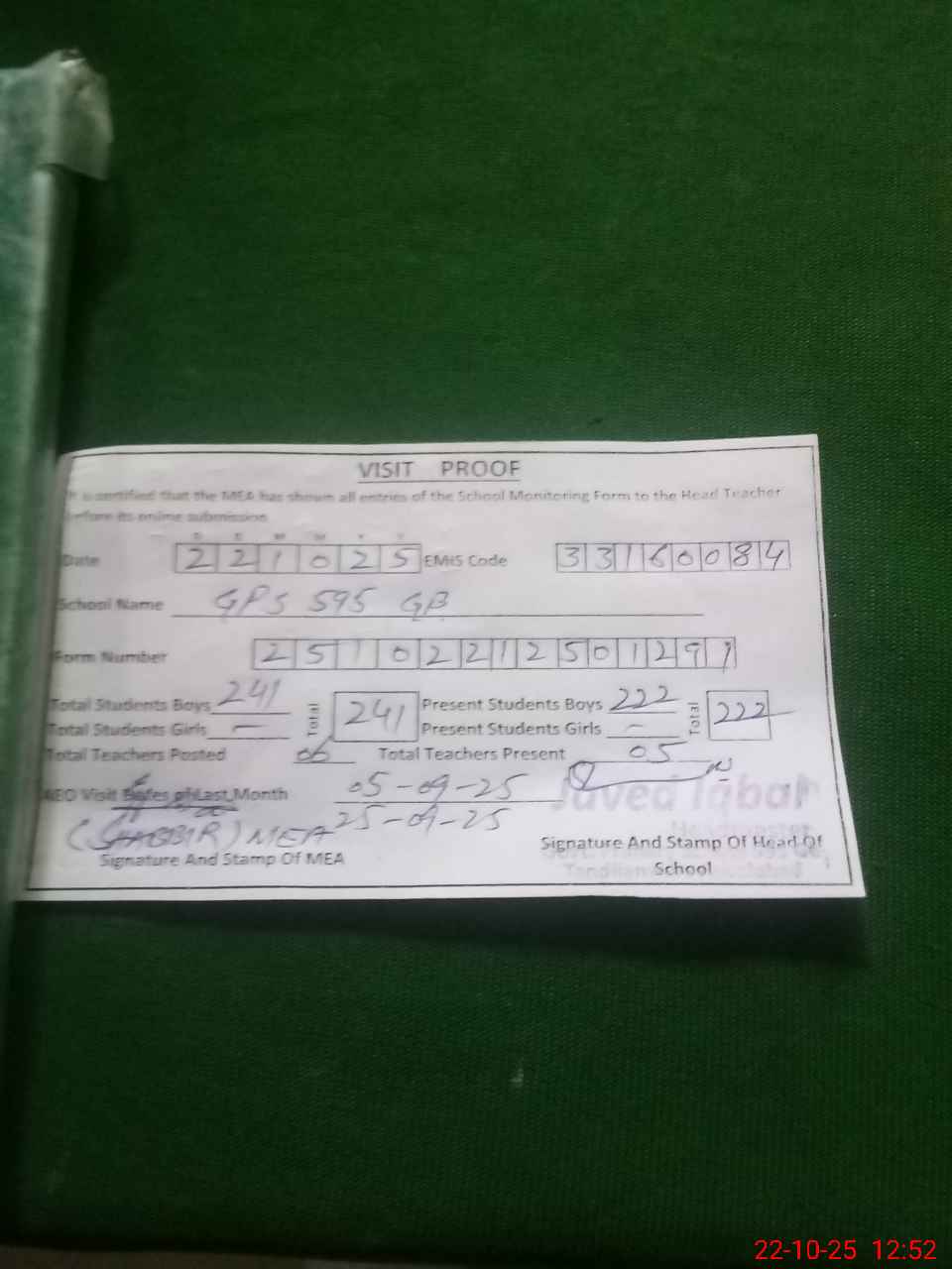 | Certified that this School was Inspected by the Undersigned MEA/DMO Today and the Information Stated Above is as Per Record. | |||||