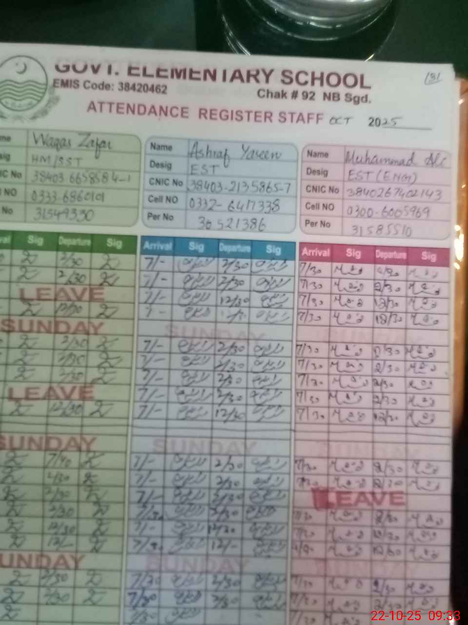 | CNIC | Full Name | Designation | R/C | Absence during last cal. month |