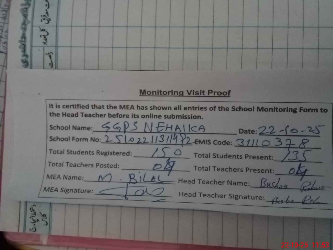 | Attendance Register | Head Teacher | MEA with School | Visit Proof |