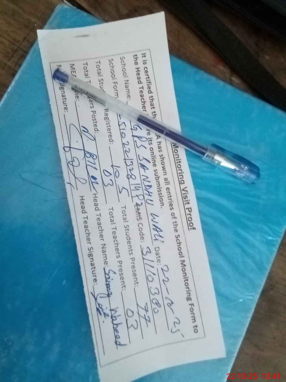 | Attendance Register | Head Teacher | MEA with School | Visit Proof |