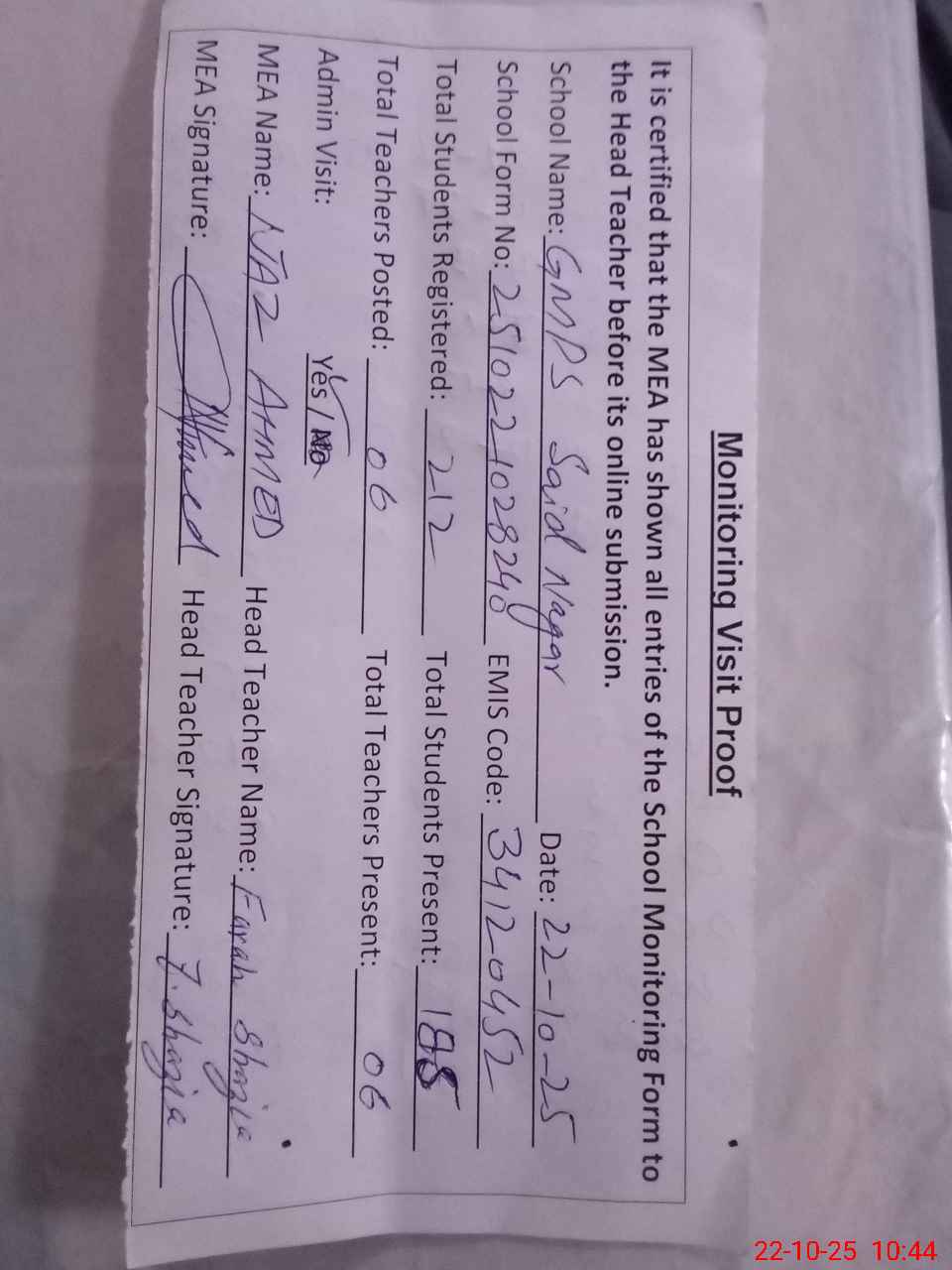 | Attendance Register | Head Teacher | MEA with School | Visit Proof |