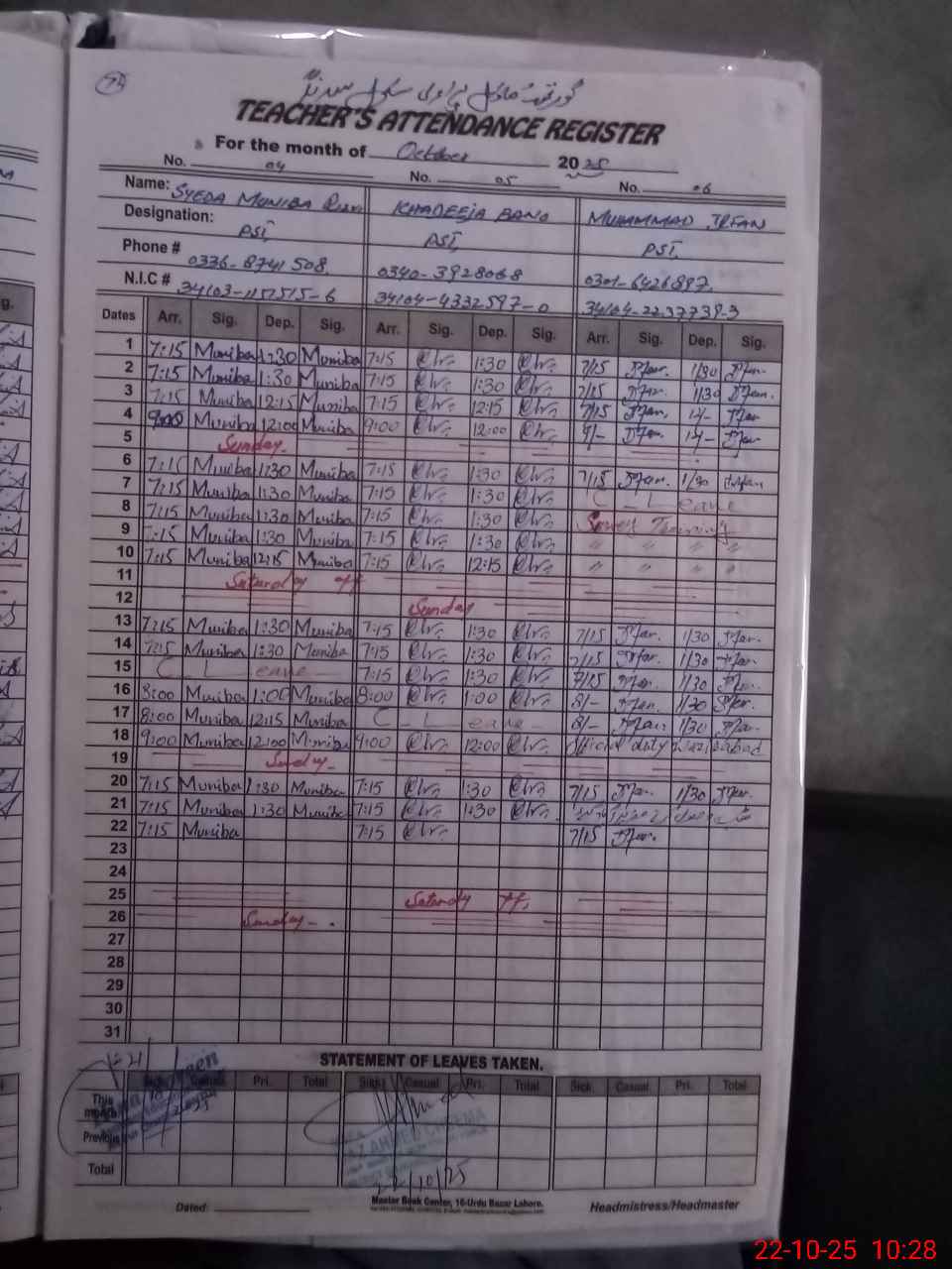 | CNIC | Full Name | Designation | R/C | Absence During Last Calender Month |