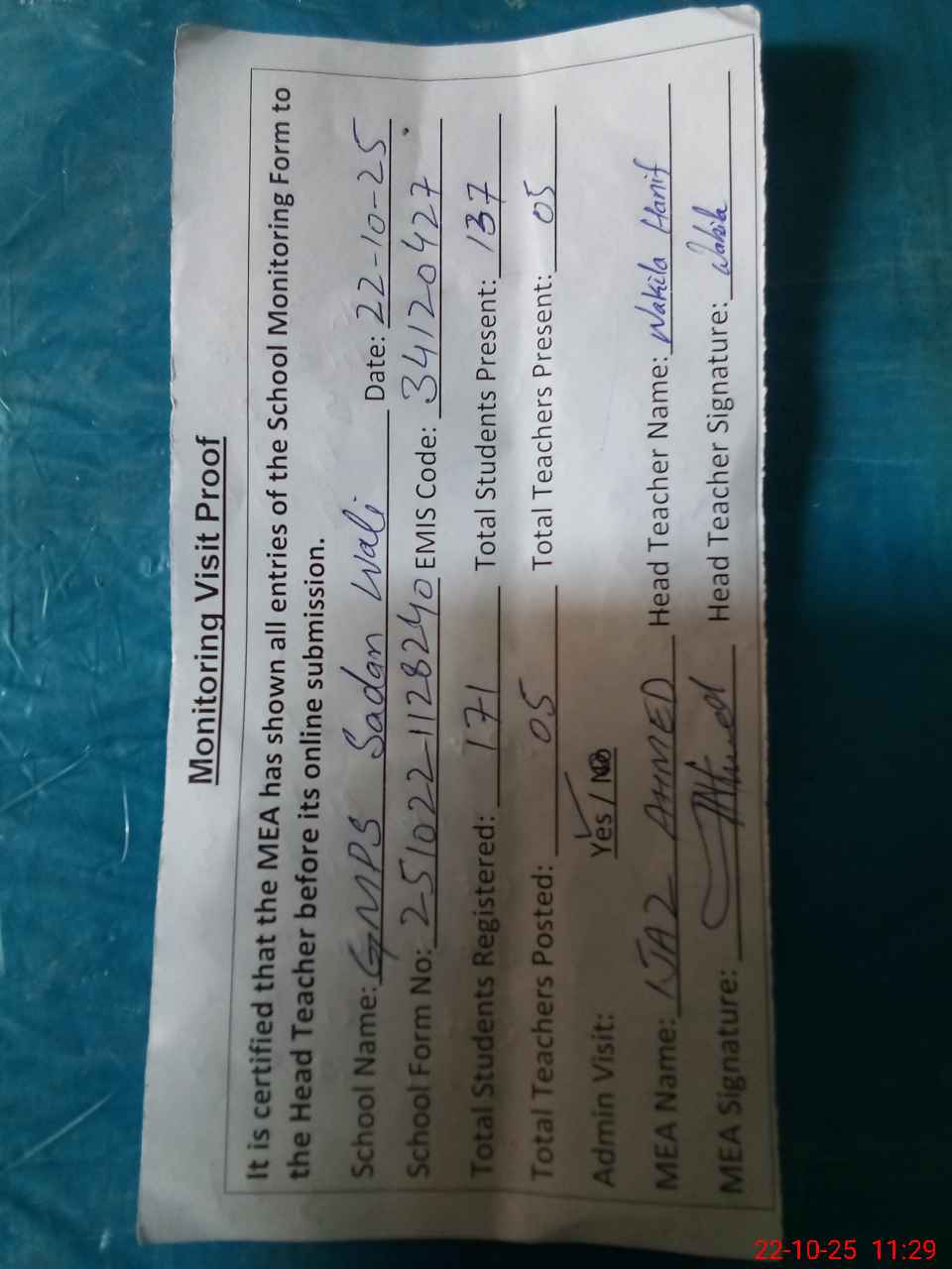 | EMIS Code: 34120427 | Name of School: GMPS SADAN WALI | |||