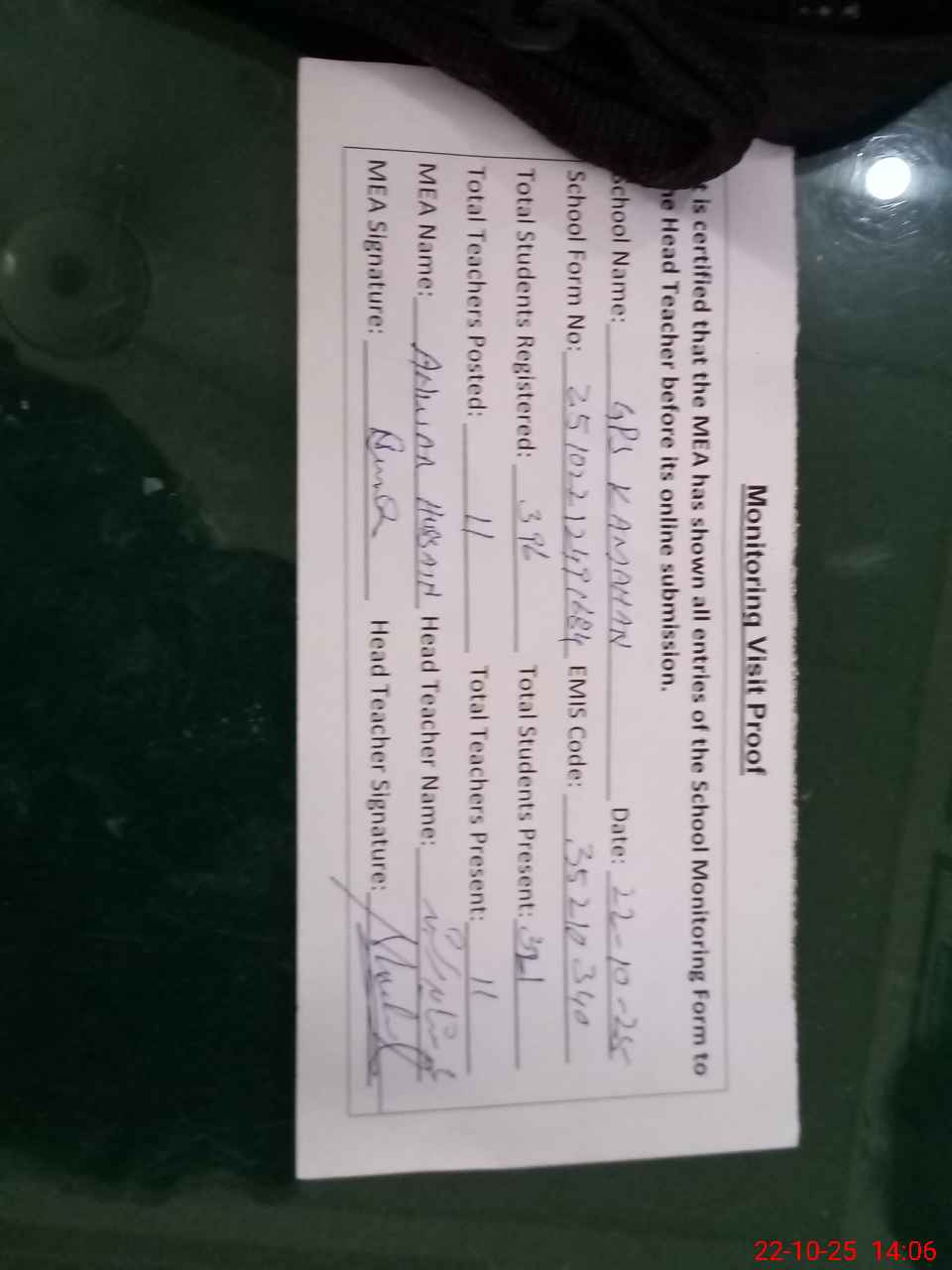| Attendance Register | Head Teacher | MEA with School | Visit Proof |