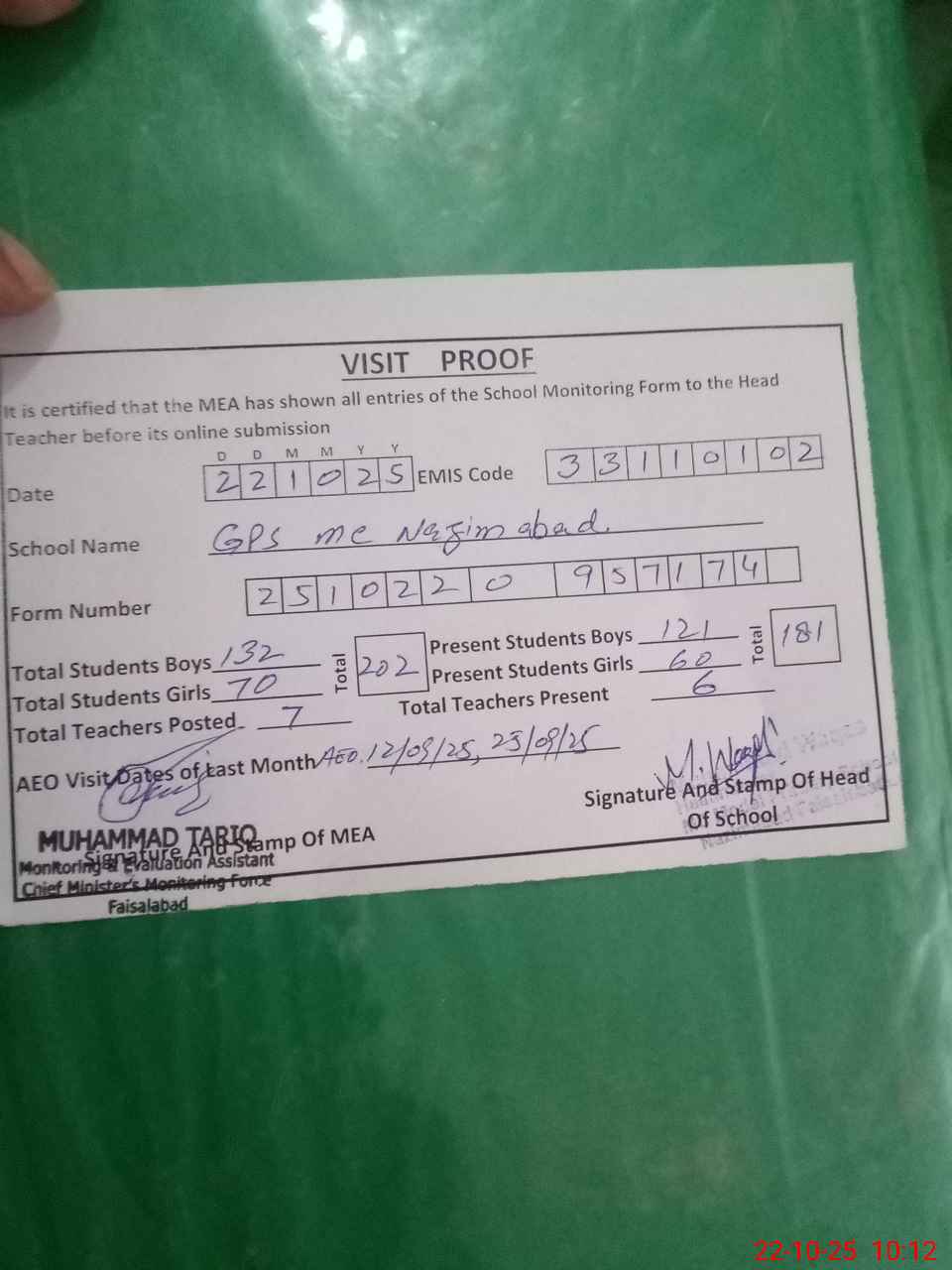 | EMIS Code: 33110102 | Name of School: GPS MC NAZIM ABAD FSD | |||