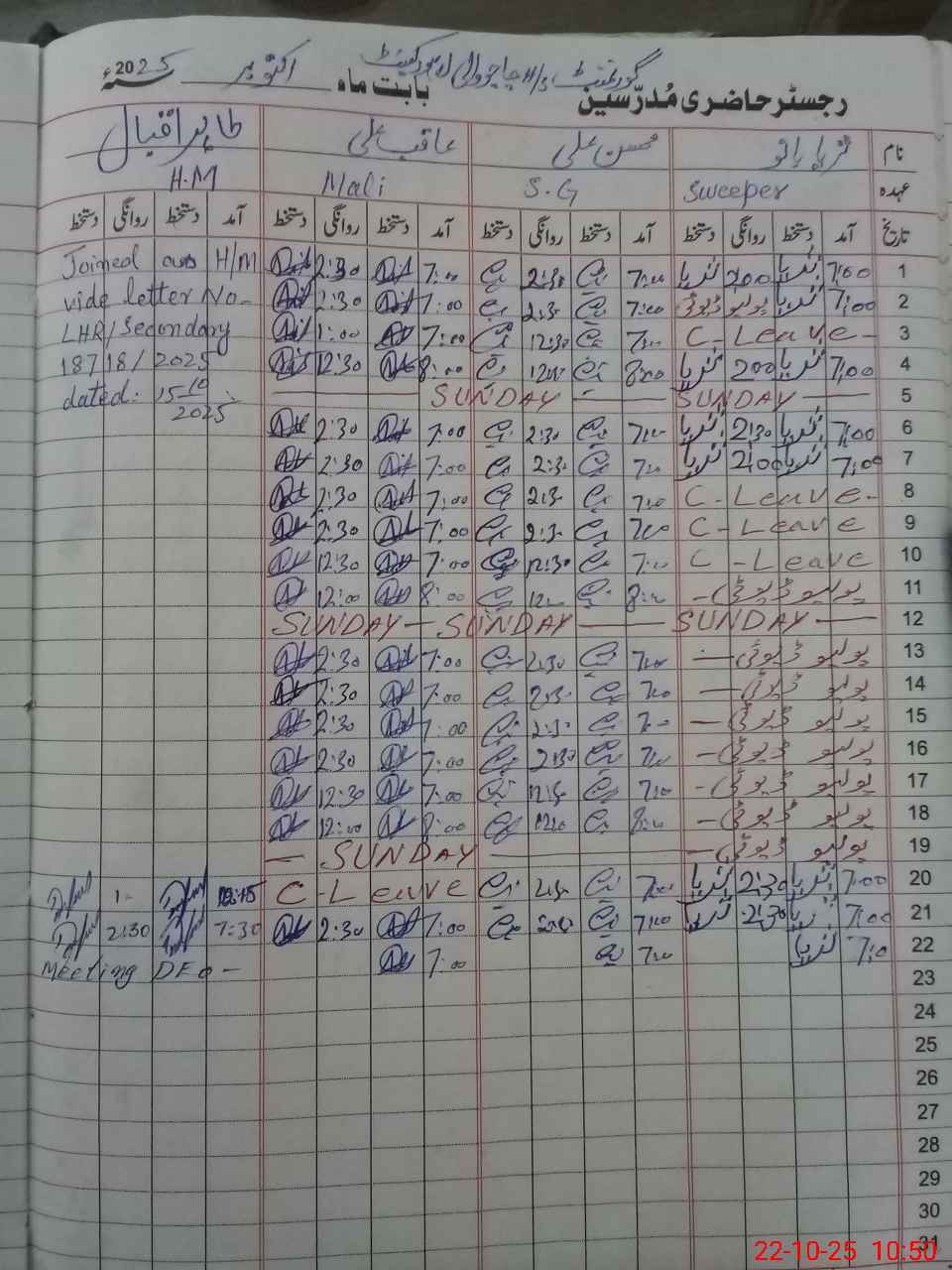 | Remarks (Use Separate Page if Required): Head Master Tahir Iqbal is not physical available in School as per attendance register and Order book he is in DEO office FTF record register is not maintained for last month | |||||