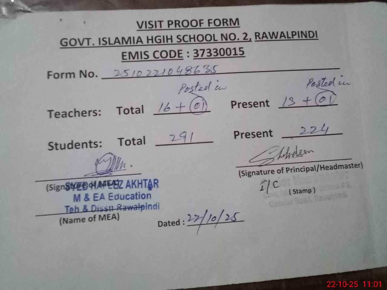 | EMIS Code: 37330015 | Name of School: GHS ISLAMIA NO. 2 RAWALPINDI | |||