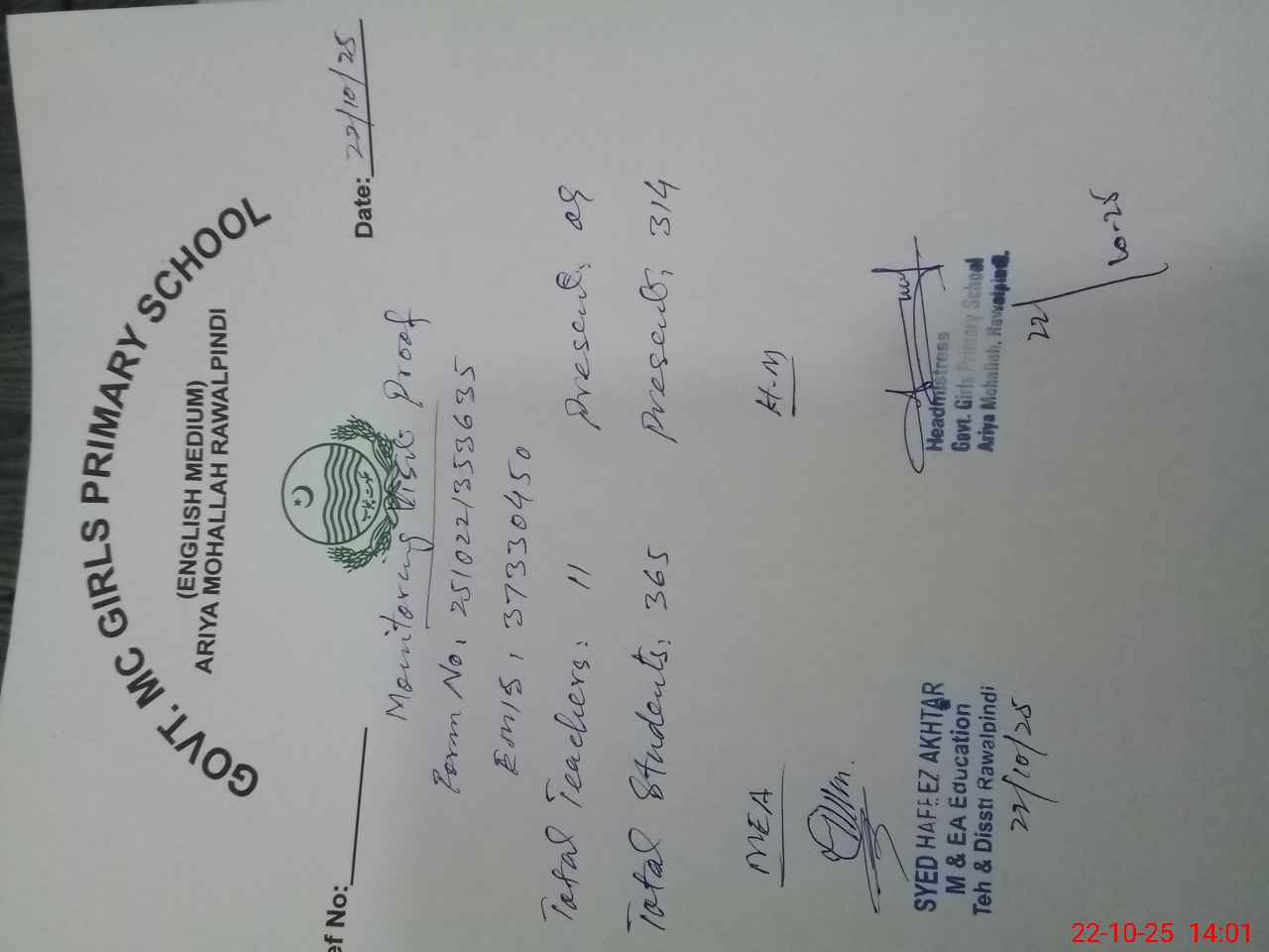| EMIS Code: 37330450 | Name of School: GGPS MC ARIYA MOHALLAH RWP | |||