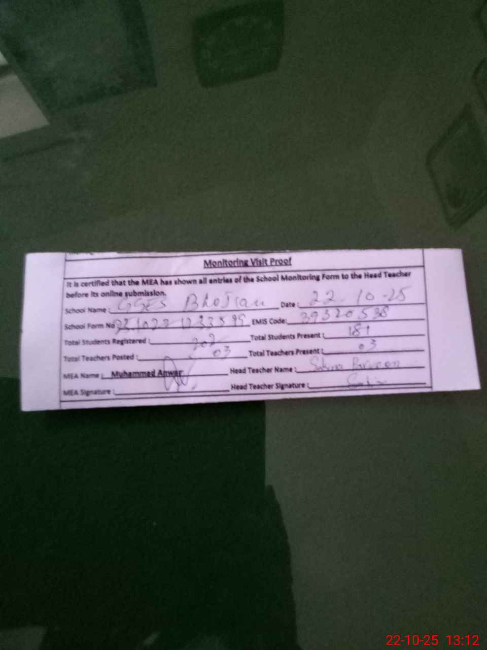 | Attendance Register | Head Teacher | MEA with School | Visit Proof |