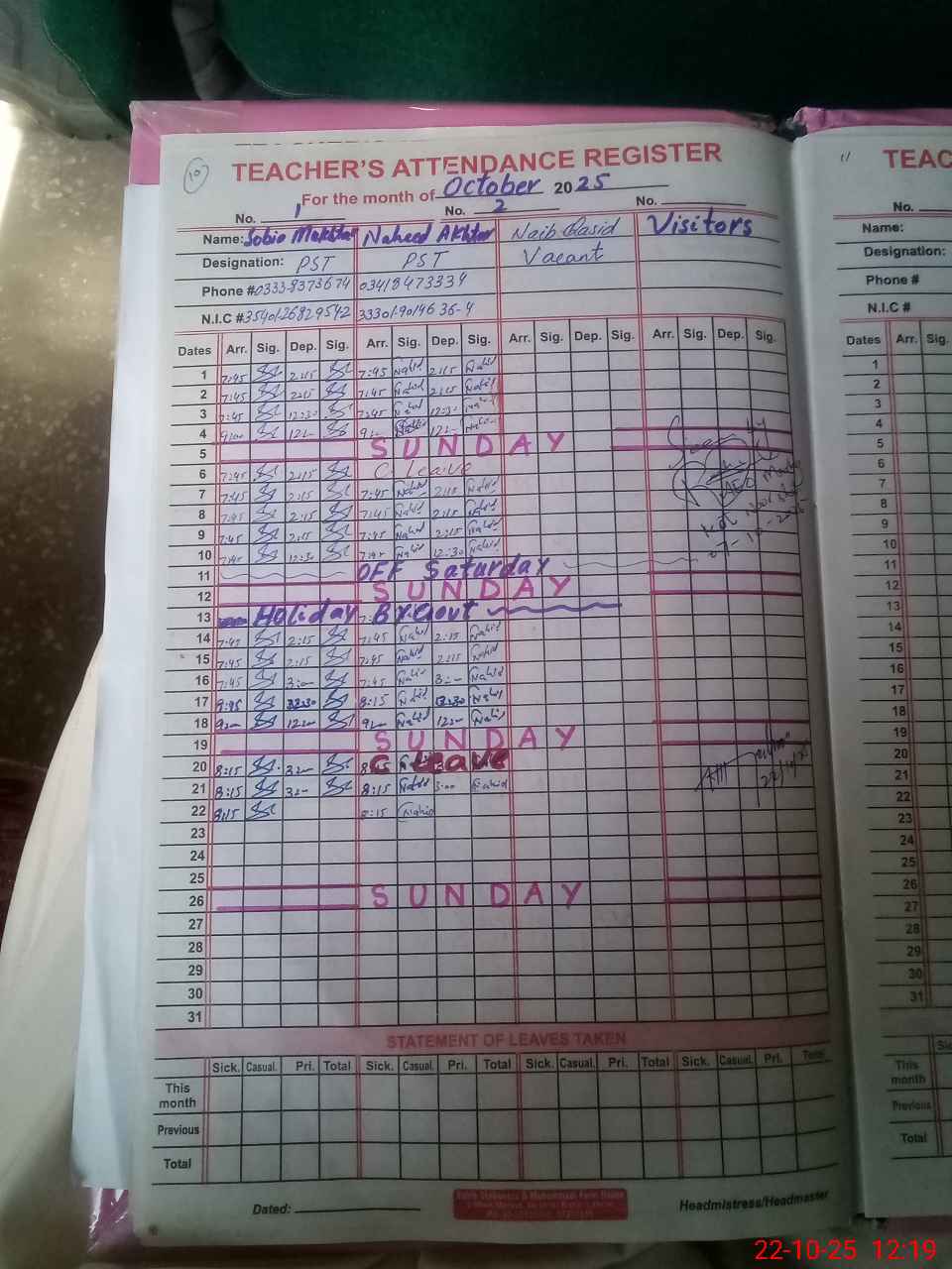 | CNIC | Full Name | Designation | R/C | Absence During Last Calender Month |